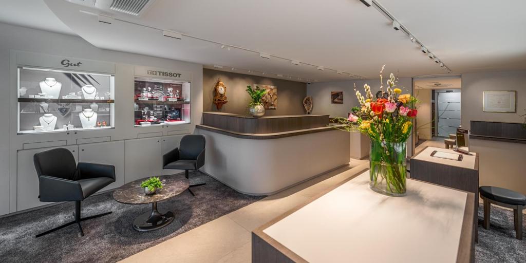 Es ist die Leidenschaft für perfektes Handwerk, welche den unverwechselbaren Gut-Spirit jetzt bereits in fünfter Generation prägt. Mit unserem Umbau haben wir dafür gesorgt, dass die Uhrmacher- und Goldschmiedekunst unseres hauseigenen Ateliers entsprechend stilvoll präsentiert werden kann. Wir sind stolz über die gelungenen baulichen Veränderungen und werden unsere Freude bei Ihrem nächsten Besuch gerne mit Ihnen teilen.