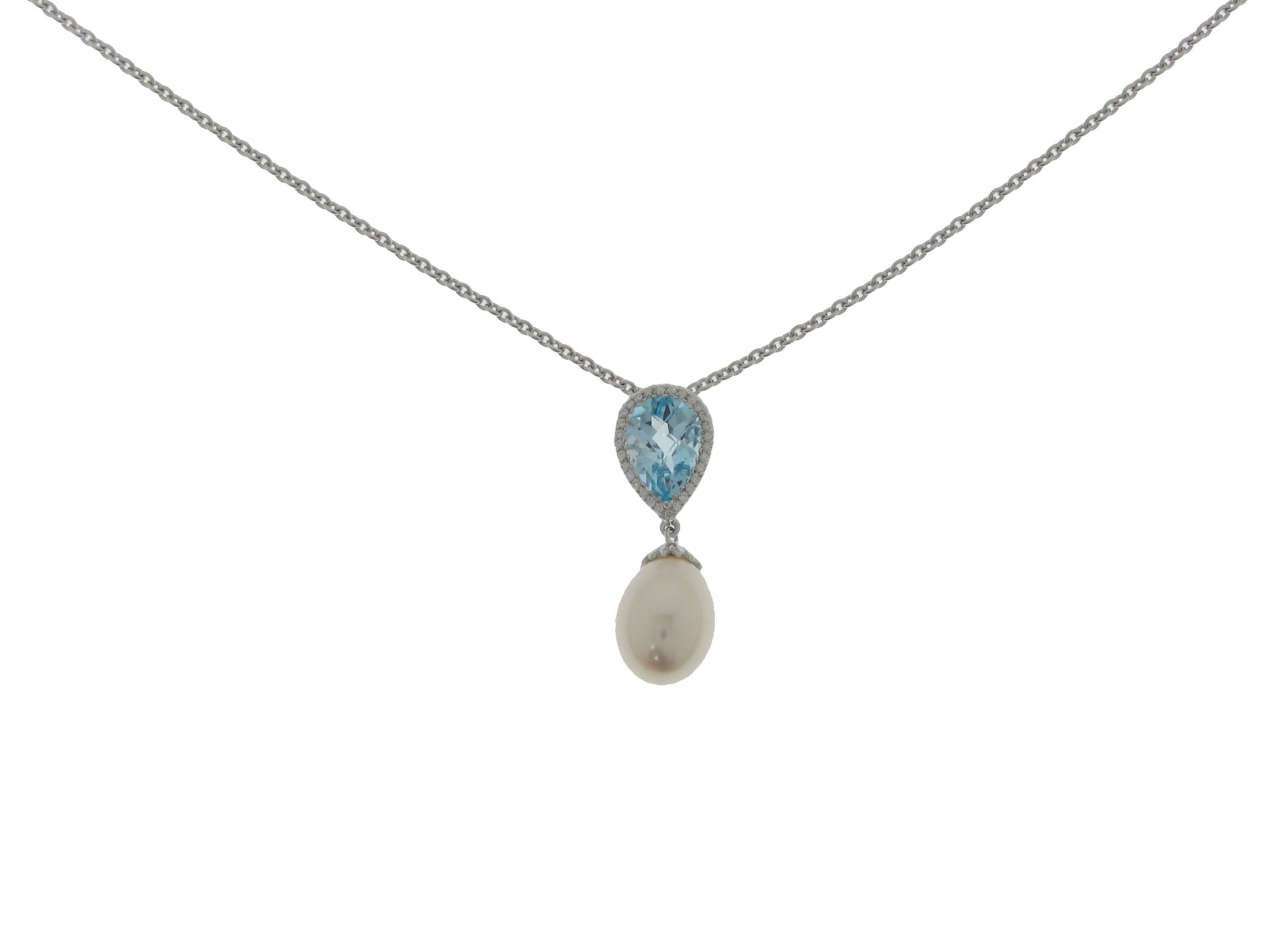 750 Weissgold und 585 Weissgold, Länge 42 cm, 1 Süsswasserkulturperle, 30 Brillanten ca. 0.6 ct ca. H si, 1 Topas, facettiert und behandelt ca. 2.1 ct, Versicherungswert: CHF 2600 ///- 4% Nickelanteil