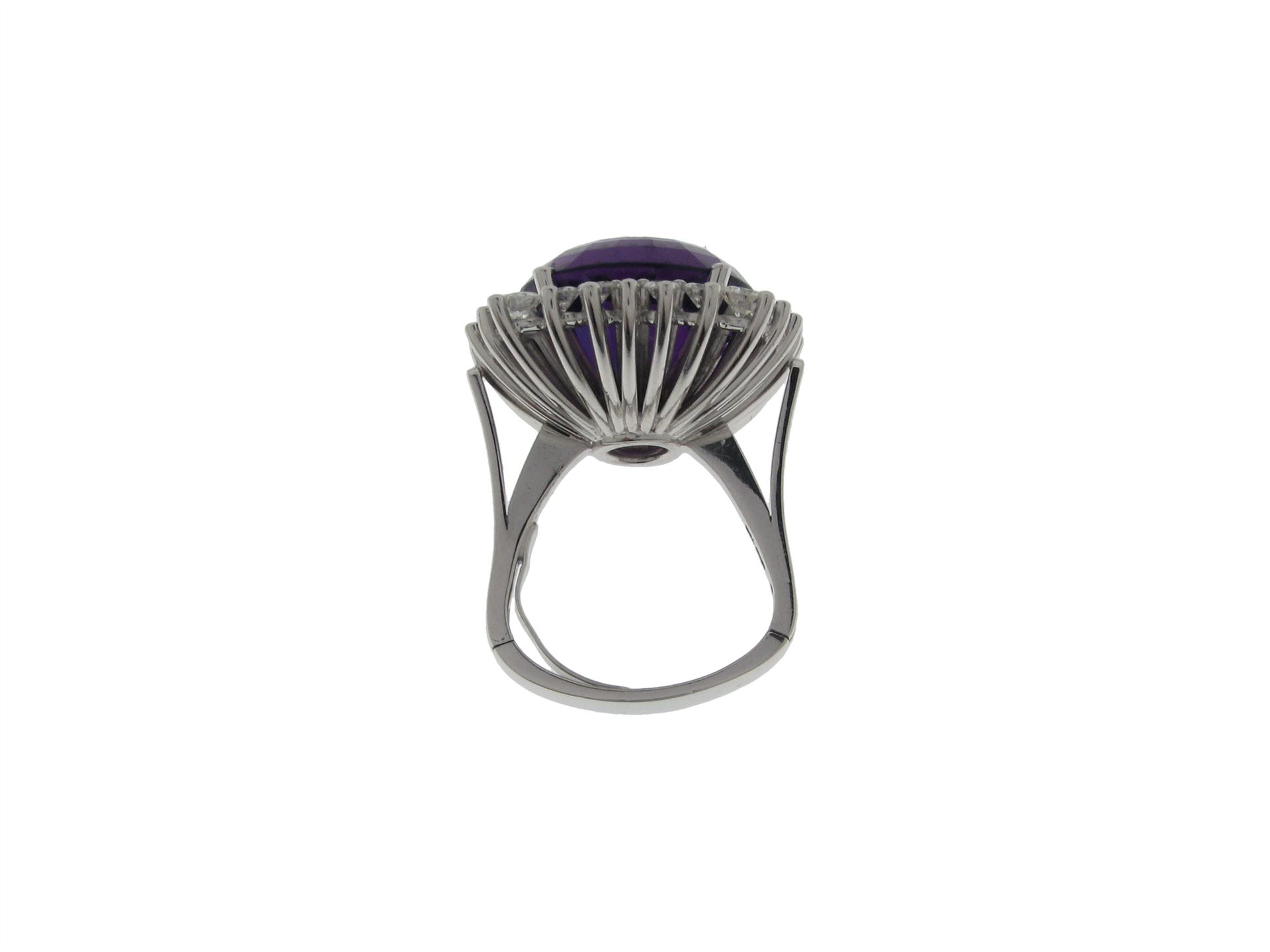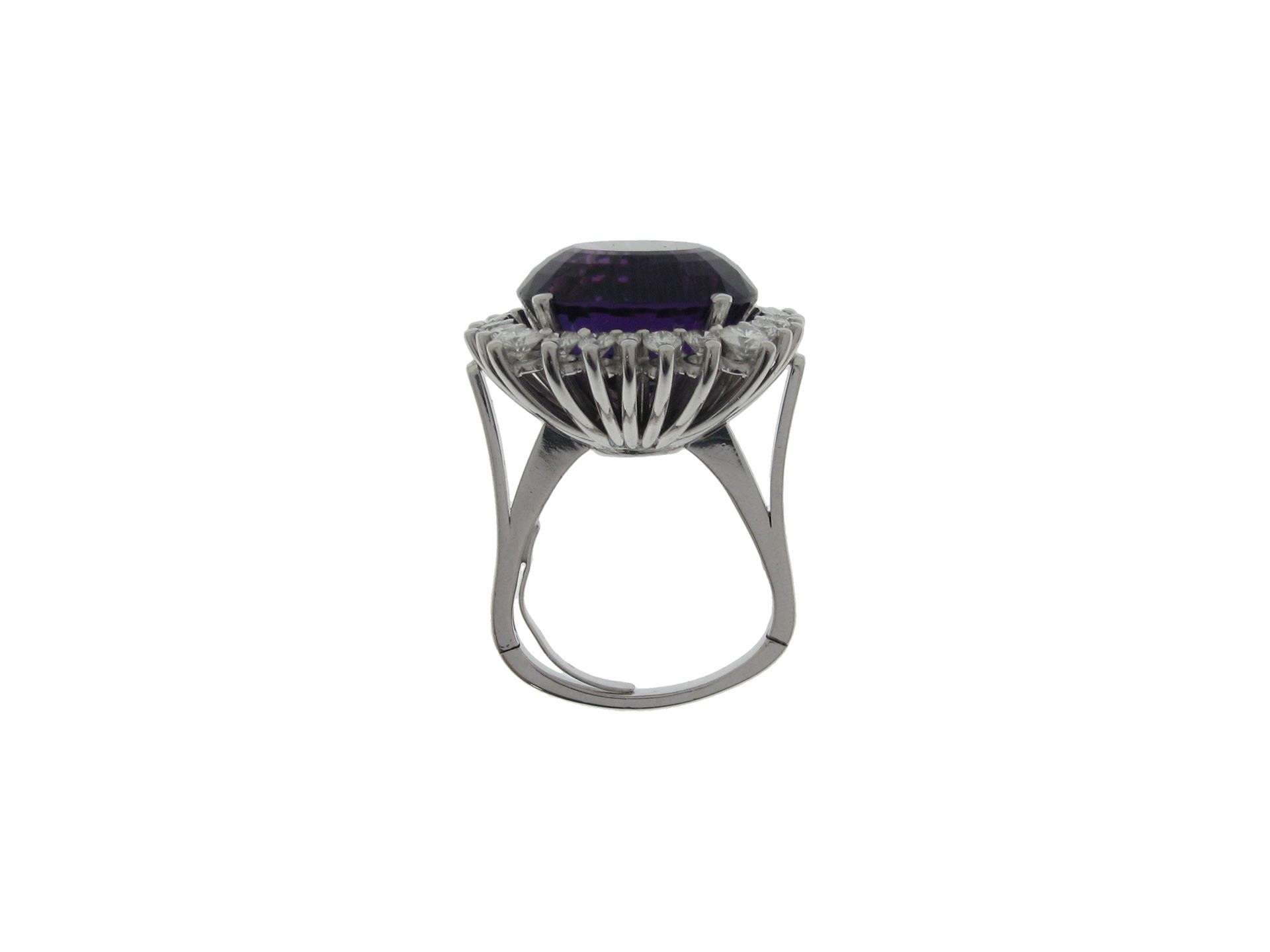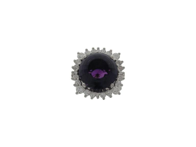 750 Weissgold (Palladium legiert), Ringgrösse 55, 24 Brillanten ca. 1.72 ct ca. F vsi, 1 Amethyst facettiert ca. 20 ct (Tragspuren), Versicherungswert: CHF 9100 ///- mit Scharnier und Feder