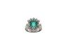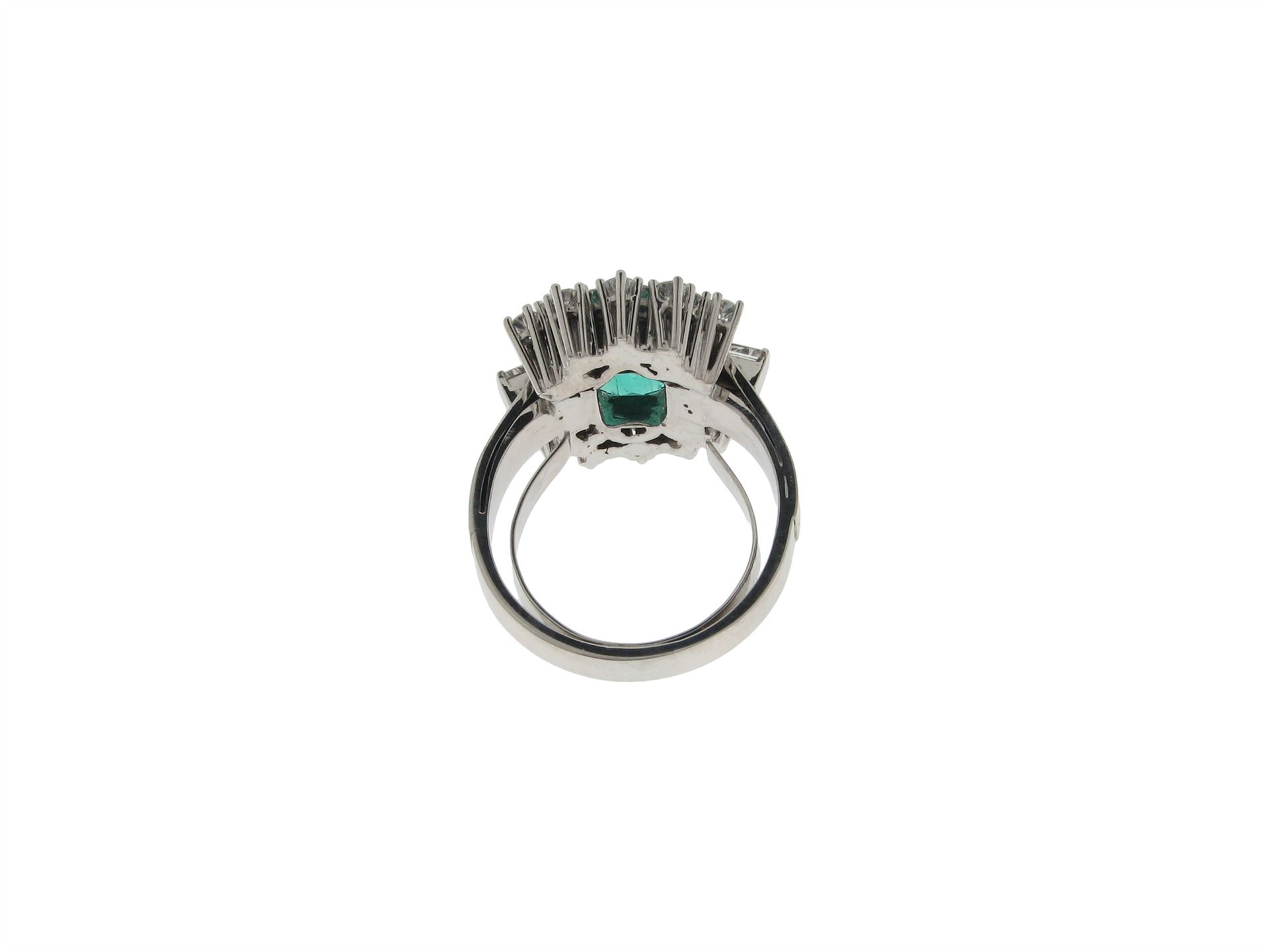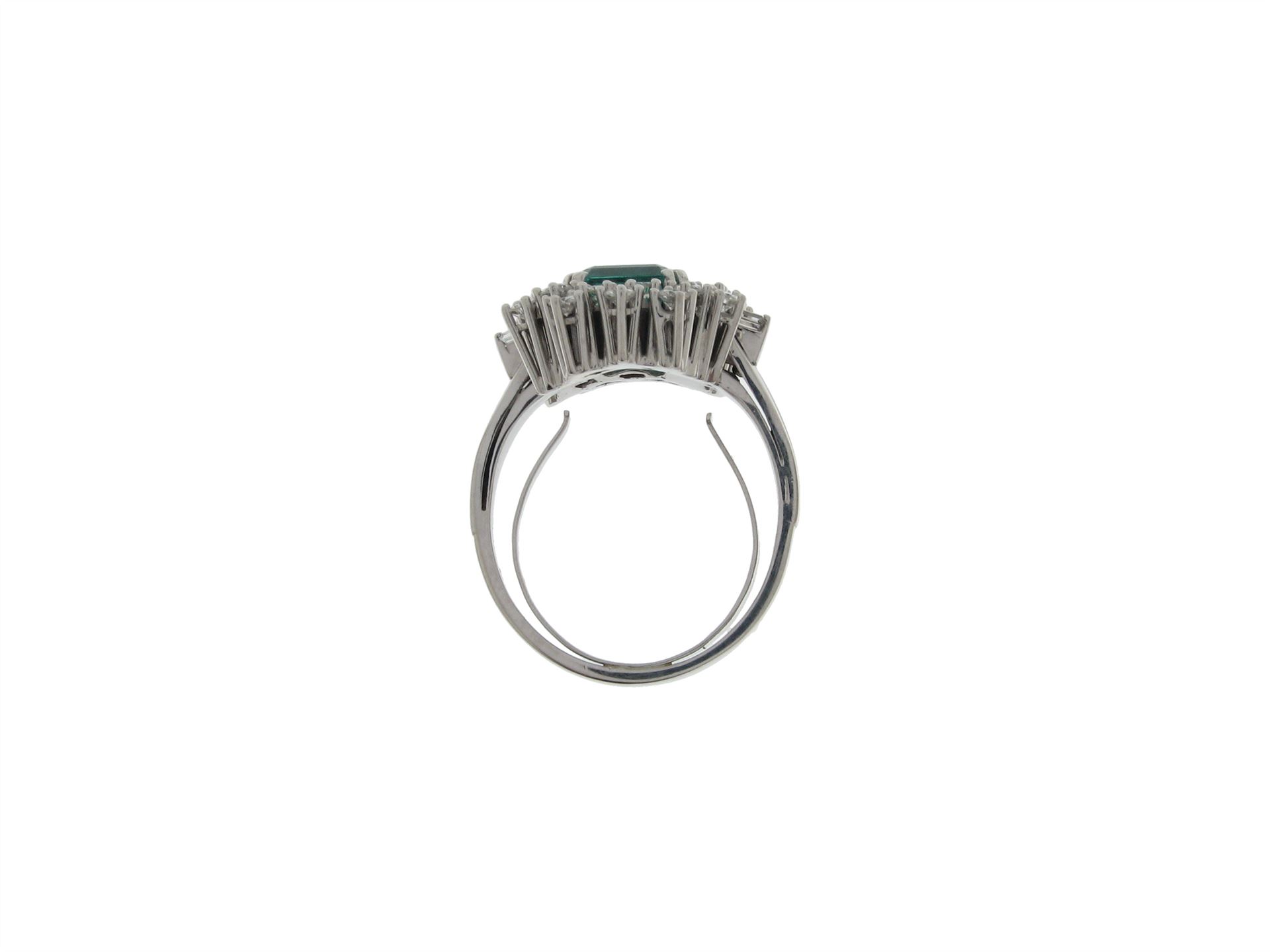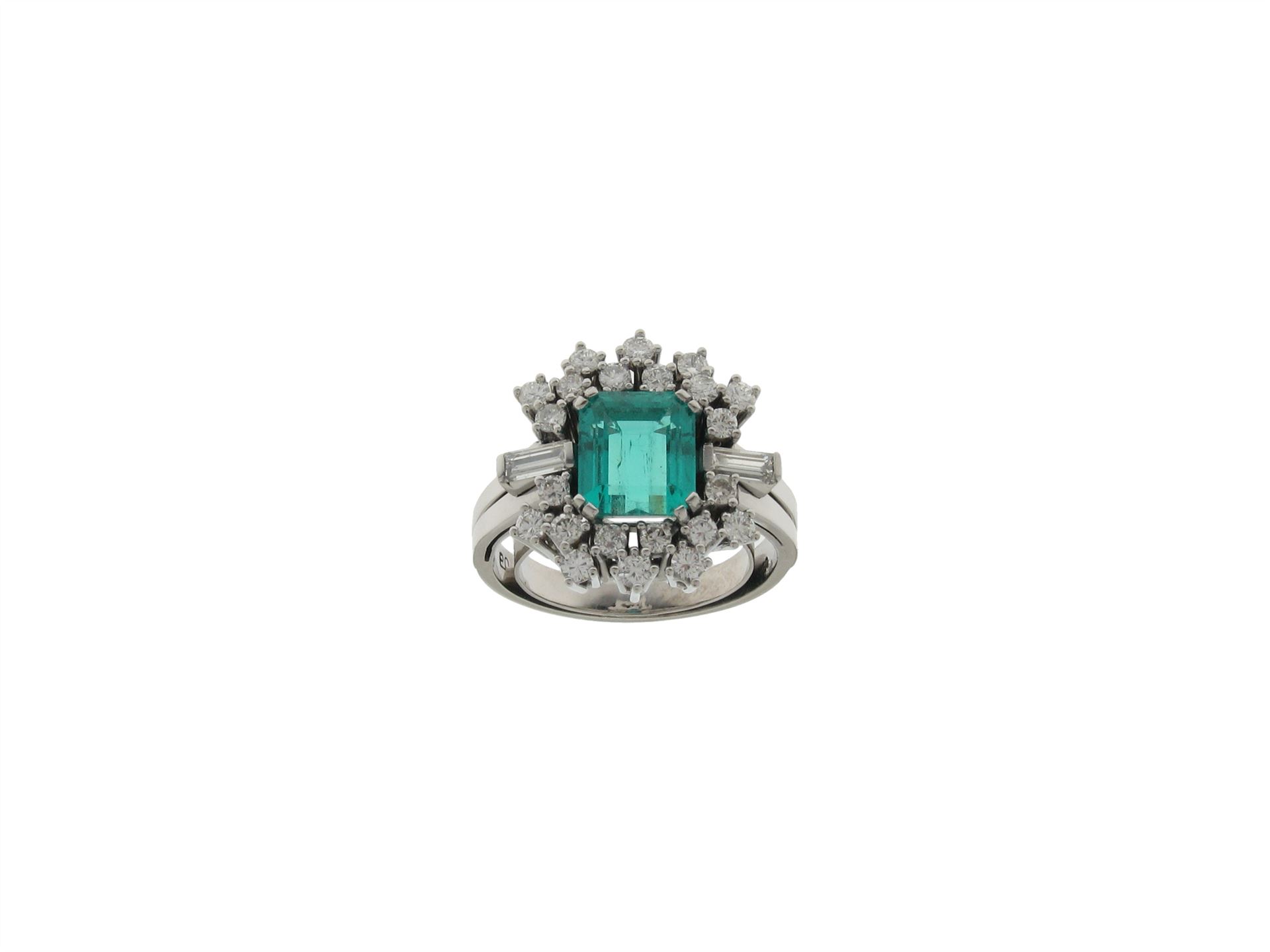 750 Weissgold (Palladium legiert), Ringgrösse 58, 22 Brillanten ca. 0.8 ct ca. G si, 2 Diamant-Baguetten ca. 0.3 ct ca. G si, 1 Smaragd facettiert ca. 2.5 ct geölt (Tragspuren), Versicherungswert: CHF 12500 ///- mit Feder beidseitig