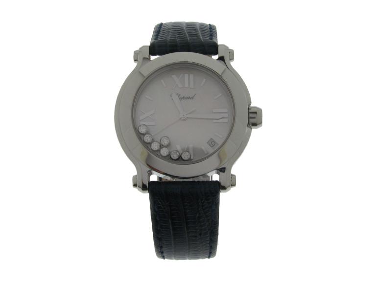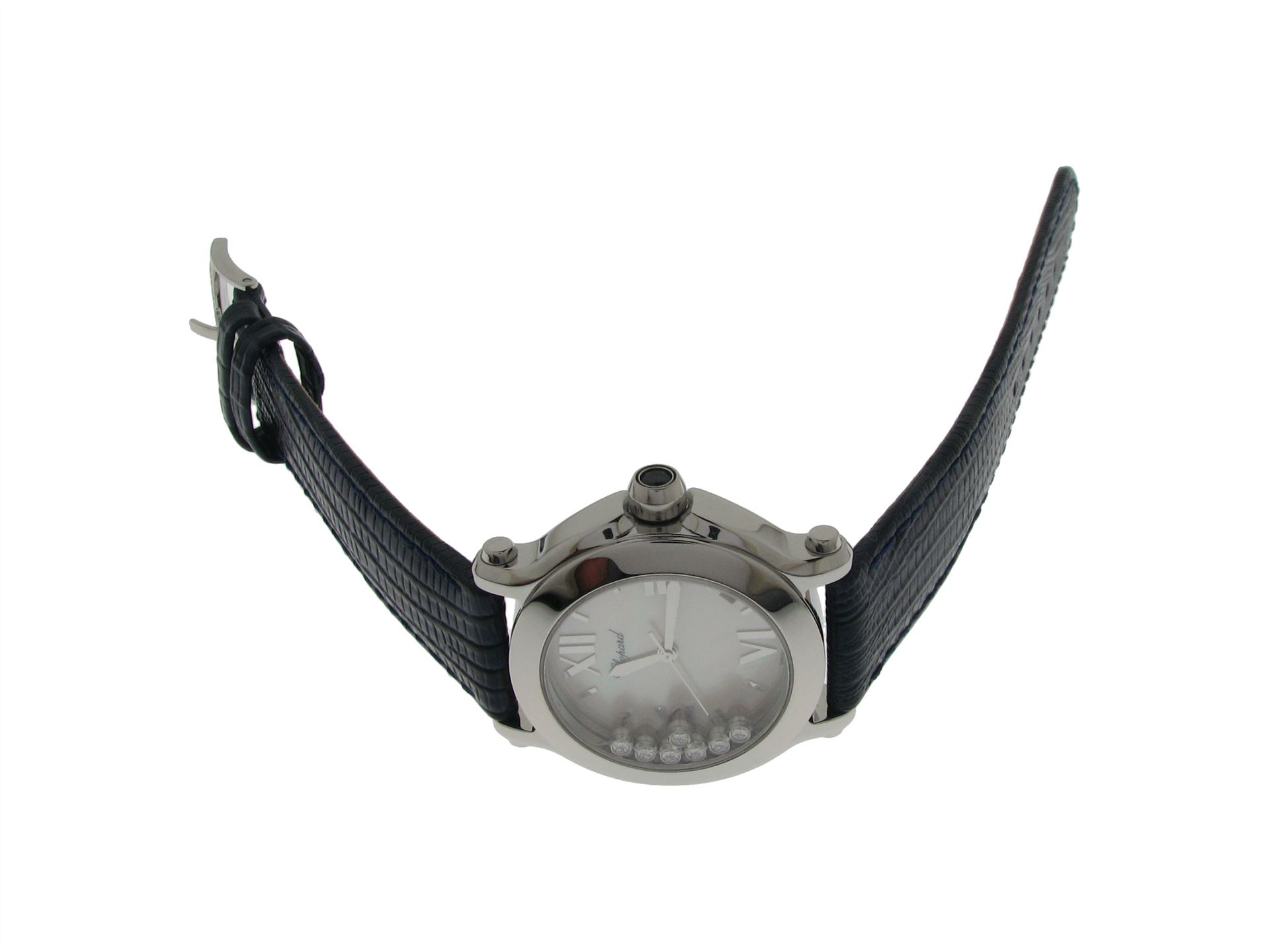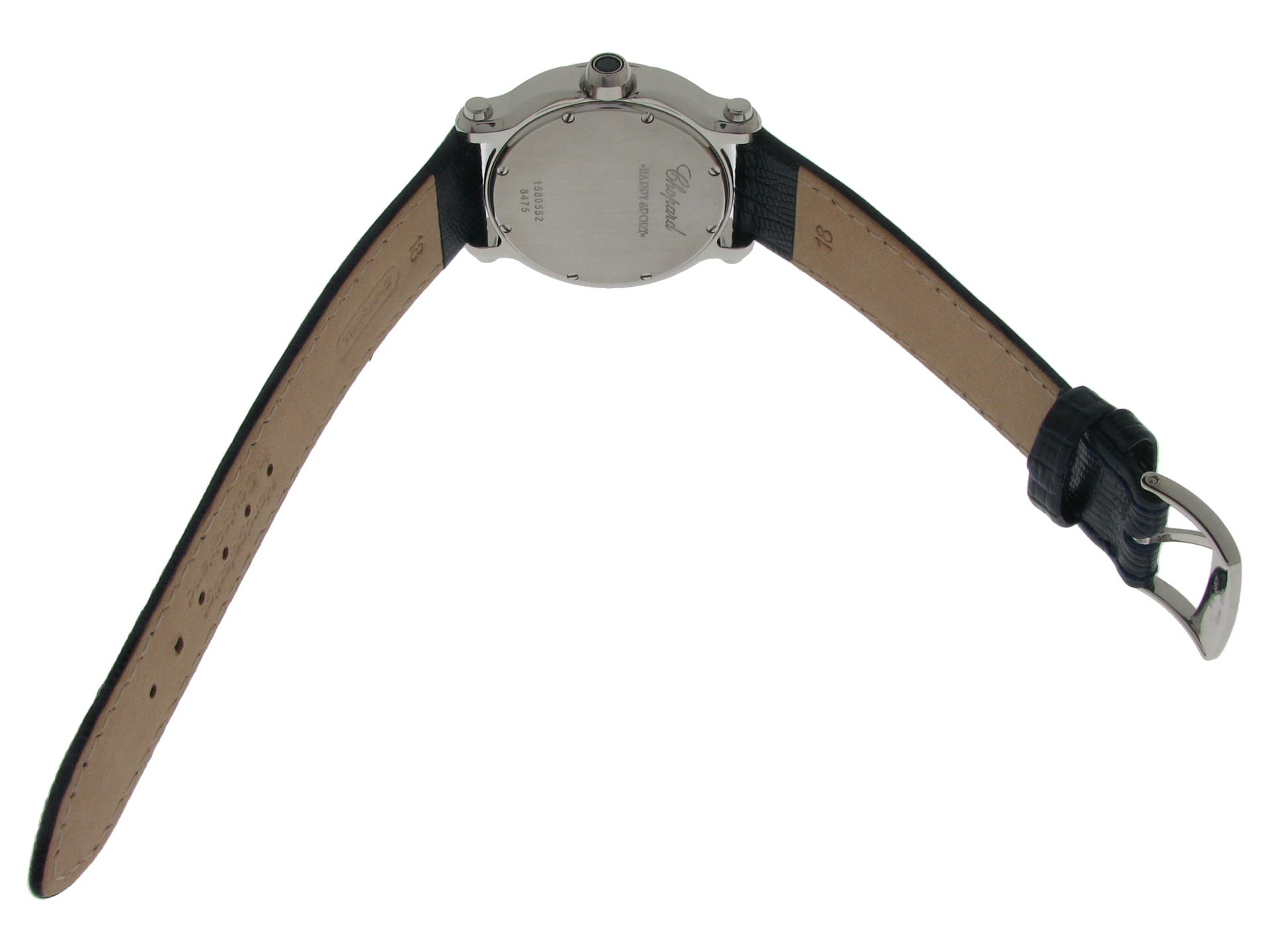 Chopard, Stahl mit Lederband, 36, 7 Brillanten, Versicherungswert: CHF 5800 ///- Chopard- Baujahr 2023- Happy Sport Ref. 8475- Saphirglas, Wasserdicht, Quarzwerk- 1 Jahr Garantie- Box (Bucherer) und Papiere